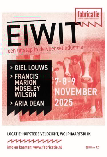 Op 7, 8 en 9 november doken we met een grote plons in de industriële prehistorie op Hofstede Veldzicht in Wolphaartsdijk. EIWIT was een uitstap in de voedselindustrie. Aan de hand van kunstpresentaties op een kapitaal en monumentaal boerenhof werden verbindingen en spanningsvelden verkend tussen ons beeld van landbouw en industriële voedselproductie.